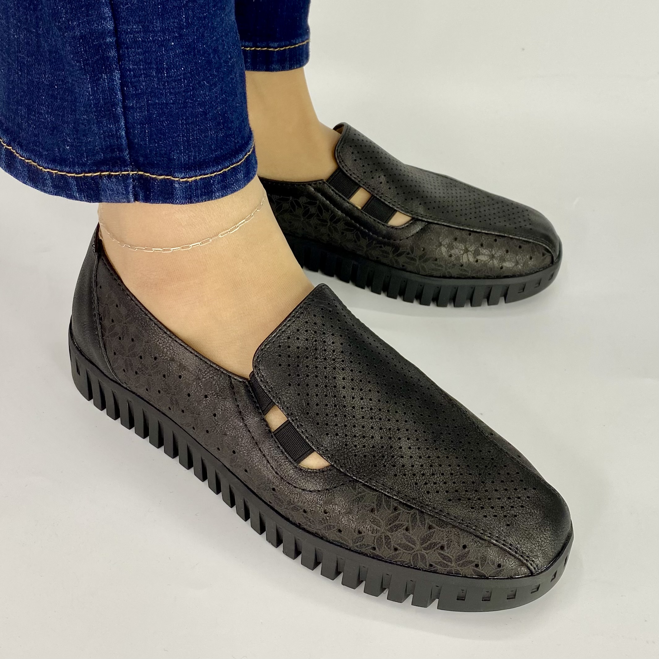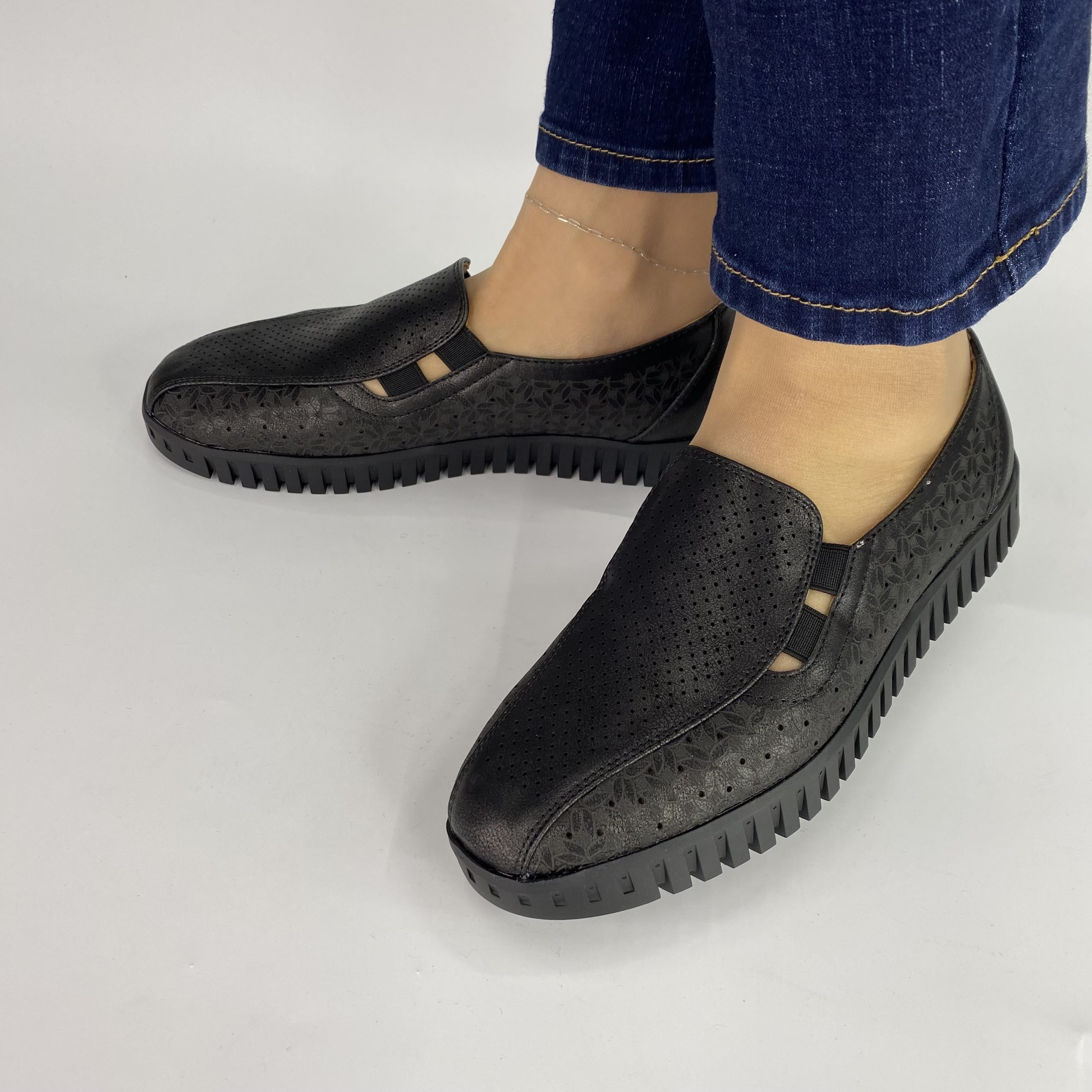Γυναικείο χαμηλό παπούτσι σε μαύρο χρώμα από μαλακό τεχνόδερμα και με ιδιαίτερο σχέδιο με μονοκόμματη σόλα .