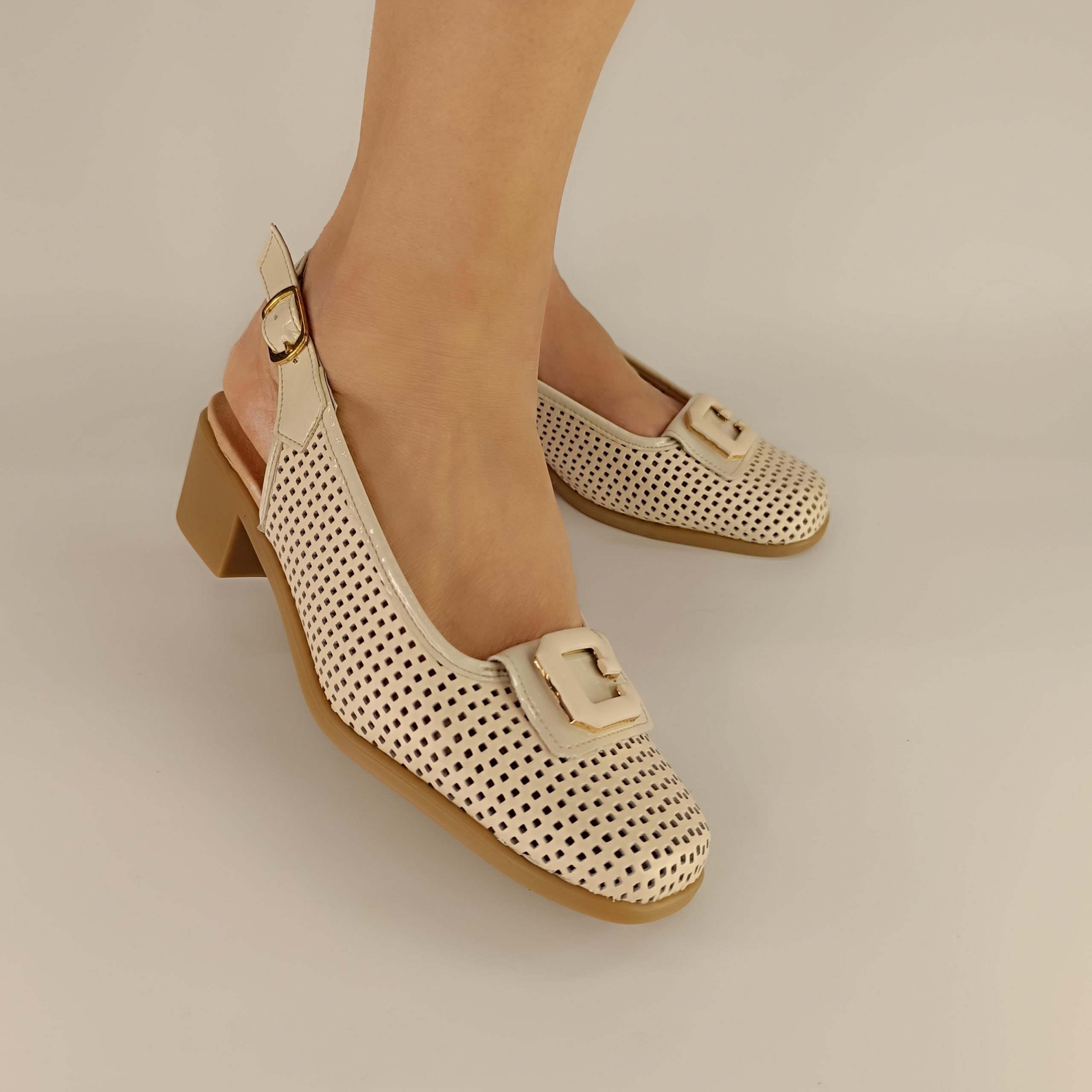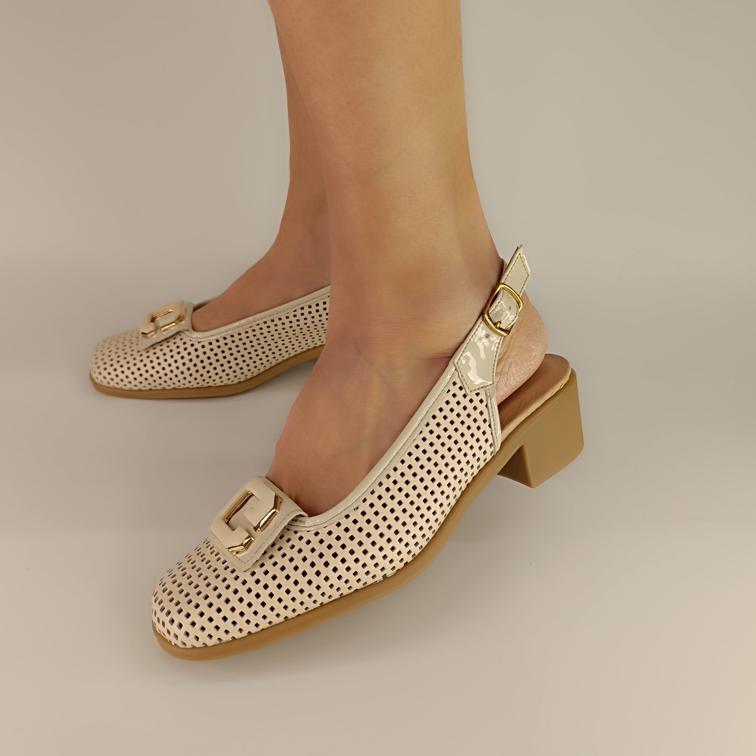 Κομψό και άνετο γυναικείο πέδιλο, κατασκευασμένο από γνήσιο δέρμα. Διαθέτει ανοιχτό, διατρητό σχέδιο που επιτρέπει στο πόδι να αναπνέει, ενώ η ανατομική του σόλα προσφέρει εξαιρετική άνεση για πολύωρη χρήση. Ο συνδυασμός μπεζ και μπλε αποχρώσεων, σε συνδυασμό με τη διακοσμητική αγκράφα στο μπροστινό μέρος, προσδίδει μια διαχρονική και κομψή εμφάνιση. Το παπούτσι κλείνει με ρυθμιζόμενο λουράκι με χρυσή αγκράφα για καλύτερη εφαρμογή. Ιδανικό τόσο για καθημερινές όσο και για πιο επίσημες περιστάσεις.