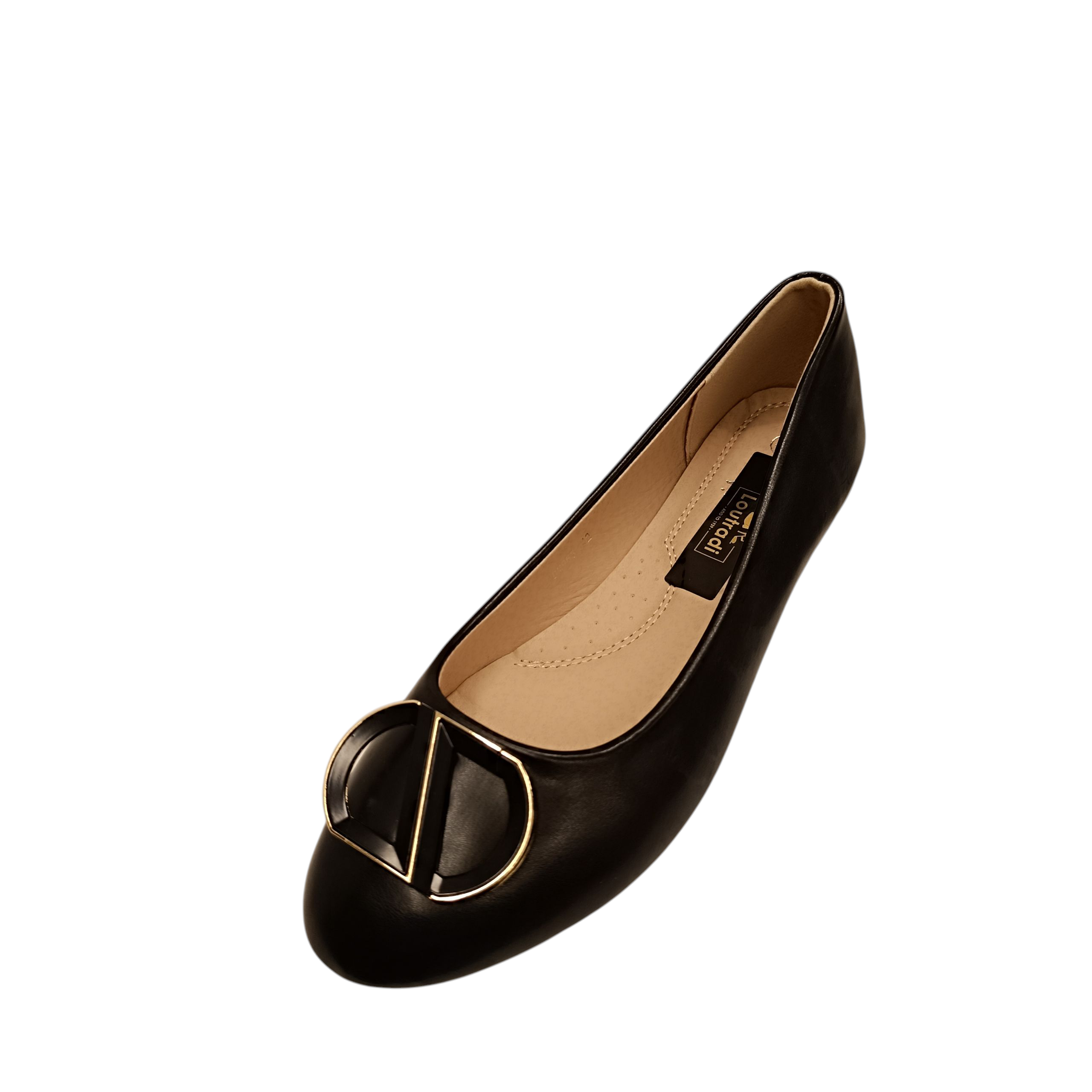 Kομψή, γυναικεία μπαλαρίνα σε μαύρή απόχρωση. Έχει κλασικό σχέδιο με στρογγυλή μύτη και χαμηλό, επίπεδο τακούνι, καθιστώντας το ιδανικό για άνετη καθημερινή χρήση.Το πάνω μέρος είναι από μαλακό, συνθετικό υλικό, δίνοντας μια πολυτελή και διαχρονική εμφάνιση. Στο μπροστινό μέρος υπάρχει ένα διακοσμητικό μεταλλικό στοιχείο σε χρυσό τόνο με ένα γεωμετρικό μοτίβο, που προσθέτει μια πινελιά κομψότητας.Το μπαλαρίνι αυτό είναι κατάλληλο για casual αλλά και πιο επίσημες περιστάσεις, καθώς μπορεί να συνδυαστεί εύκολα με διάφορα στυλ, από φορέματα μέχρι παντελόνια.