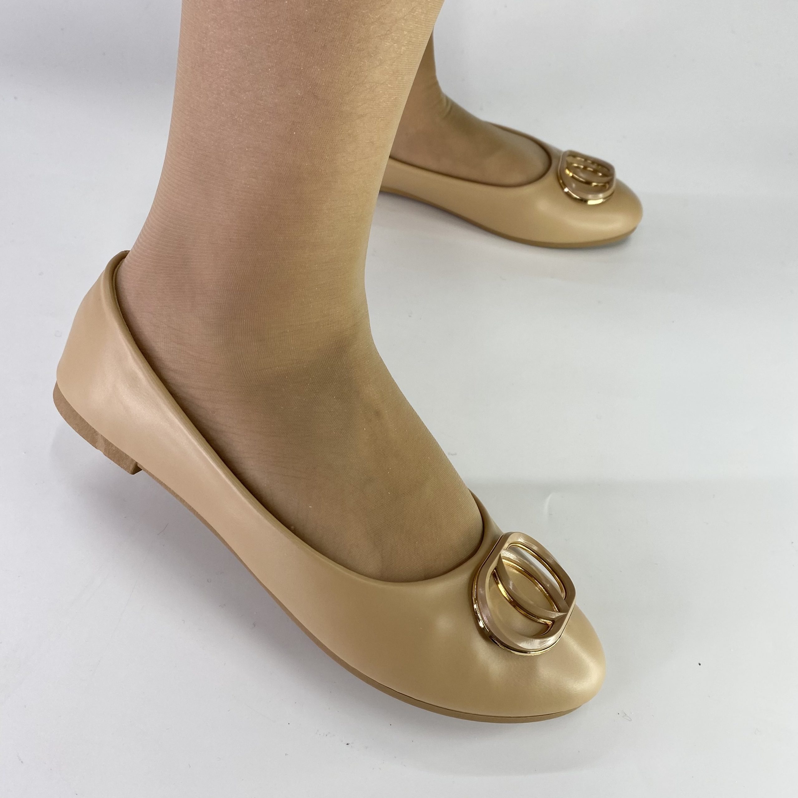 Kομψή, γυναικεία μπαλαρίνα σε μπέζ απόχρωση. Έχει κλασικό σχέδιο με στρογγυλή μύτη και χαμηλό, επίπεδο τακούνι, καθιστώντας το ιδανικό για άνετη καθημερινή χρήση.Το πάνω μέρος είναι από μαλακό, συνθετικό υλικό, δίνοντας μια πολυτελή και διαχρονική εμφάνιση. Στο μπροστινό μέρος υπάρχει ένα διακοσμητικό μεταλλικό στοιχείο σε χρυσό τόνο με ένα γεωμετρικό μοτίβο, που προσθέτει μια πινελιά κομψότητας.Η μπαλαρίνα αυτό είναι κατάλληλη για casual αλλά και πιο επίσημες περιστάσεις, καθώς μπορεί να συνδυαστεί εύκολα με διάφορα στυλ, από φορέματα μέχρι παντελόνια.
